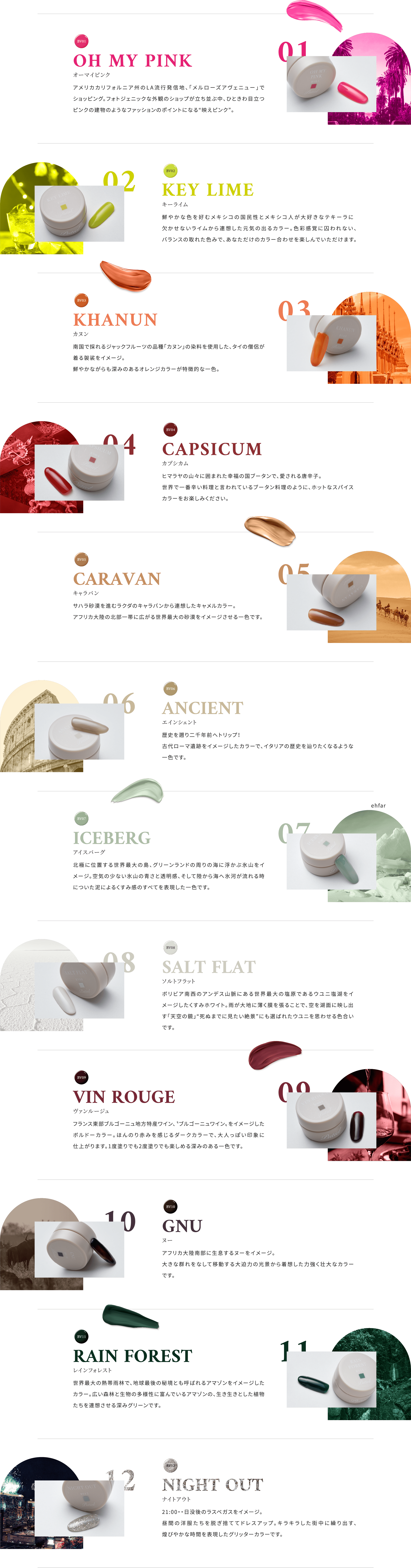 這種色彩的靈感來自於21:00──日落後的拉斯維加斯。在白天的衣物脫下後,換上華麗的服裝。這是一種閃亮的顏色,表現了閃閃發光的城市中閃爍的華麗時光。